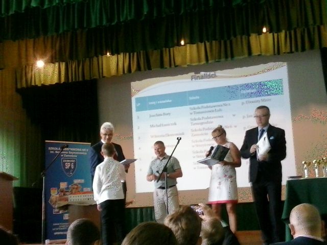 W piątek 10.06.2016r. w I Liceum Ogólnokształcącym im. Jana Zamoyskiego w Zamościu odbyło się uroczyste podsumowanie konkursów informatycznych dla SP, Gimnazjum i Szkół Ponadgimnazjalnych, których głównym organizatorem było Lubelskie Samorządowe Centrum Doskonalenia Nauczycieli w Zamościu. Uczniowie naszej szkoły: Żaroffe Patryk - kl.V, Naja Przemysław - kl.VI i Prystupa Adam kl.VI w rywaliacji drużynowej zostali Finalistami i zdobyli puchar finalistów. Finaliści otrzymali pamiątkowe dyplomy, nagrody rzeczowe i puchar drużynowy wraz z podziękowaniem dla szkoły. Również docenieni zostali nauczyciele za swoją pracę, otrzymując podziękowania i nagrody rzeczowe. Gratulujemy!!! Do konkursu uczniów przygotowała p.Maria Mielniczuk.