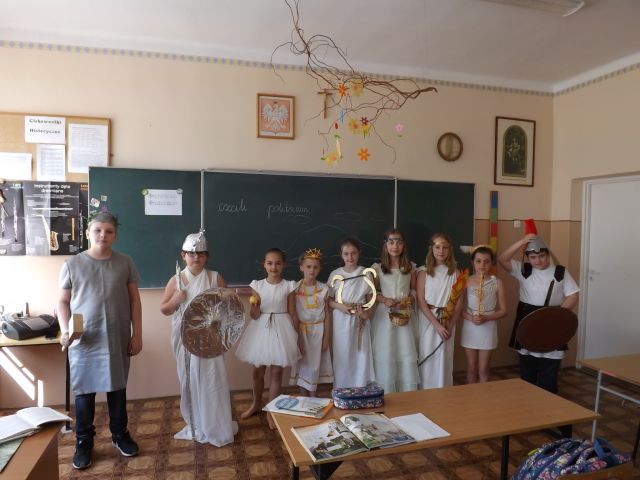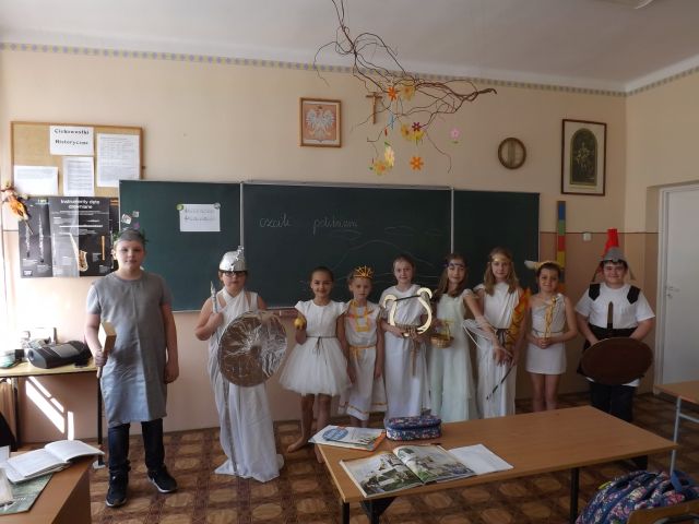 Niecodzienna lekcja miała miejsce w klasie IV 12 kwietnia 2017r. Tego dnia do krainy mitów przenieśli nas uczniowie klasy 4, którzy w ramach lekcji historii pod kierunkiem nauczyciela p.B. Wojtiuk przygotowali prezentacje wybranego boga mitologii greckiej. Czwartoklasiści pięknie przebrani za bogów i boginie, z atrybutami w dłoni, w ciekawy sposób opowiadali o sobie. Wśród bogów na Olimpie znaleźli sie: Hera, Hefajstos, Afrodyta, Ares, Hermes, Atena, Hades z Cerberem, Demeter, Dionizos. Uczniowie wykazali się pomysłowością i twórczym podejściem do tematu. Dziękujemy pani Basi za pomysłową lekcję!