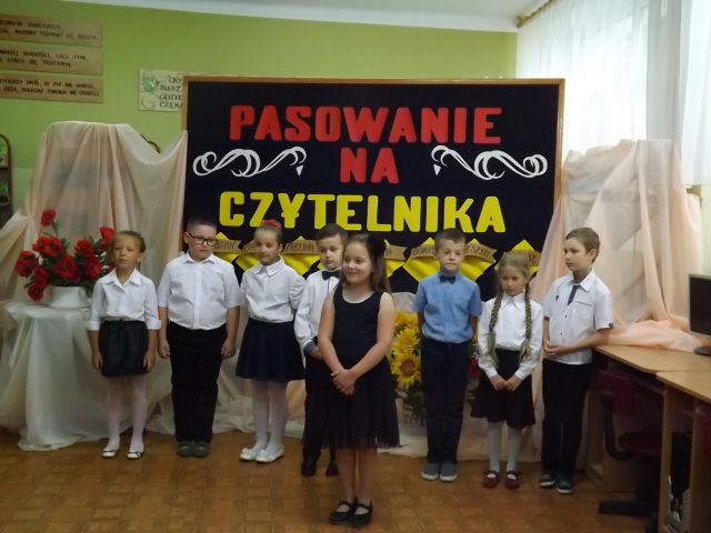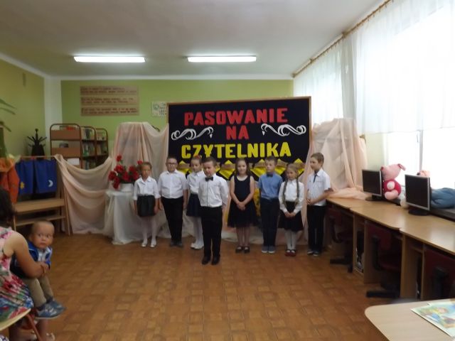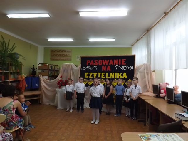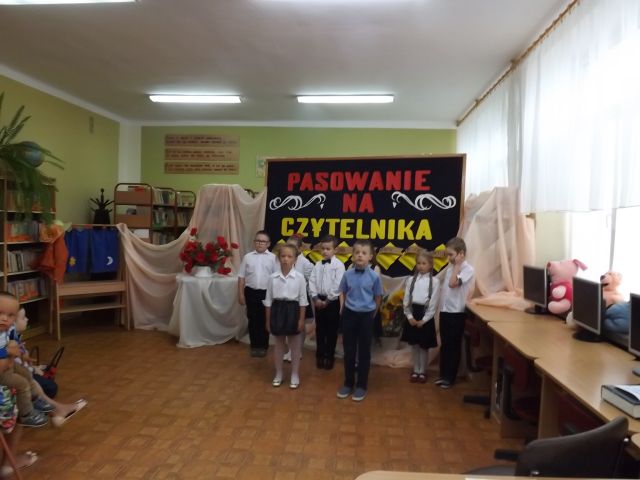 Ważną uroczystością w klasie pierwszej było pasowanie uczniów na czytelników szkolnej biblioteki. Dzieci pomyślnie zdały „egzamin”. Następnie przyrzekały przed panią dyrektor, wychowawczynią i rodzicami, że będą czytać i szanować książki. Bibliotekarka pani Zofia Smolej pasowała uczniów kl.I na czytelników kładąc każdemu na ramieniu księgę. Dzieci otrzymały pamiątkowe dyplomy. Na zakończenie uroczystości świeżo upieczeni czytelnicy recytowali wiersze o książce i bibliotece i zaśpiewali piosenki. Rodzice przygotowali słodki poczęstunek dla dzieci i zaproszonych gości.