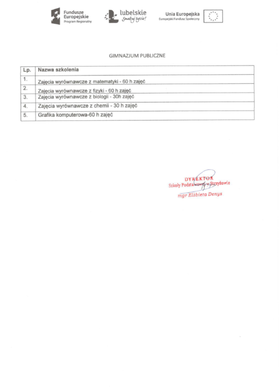 Regulamin [2.42 MB] Zał. nr 1. Formularz rekrutacyjny dla ucznia (1) [830.50 kB] Ankieta dotyczaca chęci uczestnictwa w zajęciach dla uczniów gimnazjum [704.50 kB] Zgoda uczestnika projektu na przetwarzanie danych osobowych [705.50 kB] Deklaracja udziału w projekcie [704.00 kB] Rezygnacja z projektu [698.50 kB] Lista osób zakwalifikowanych do projektu [847.00 kB] Wykaz szkoleń [709.00 kB] Usprawiedliwienie nieobecności [698.50 kB] Ankieta dotycząca chęci uczestnictwa w zajęciach dla nauczycieli [700.00 kB] Formularz rekrutacyjny dla nauczyciela [823.50 kB] Ankieta dotycząca chęci uczestnictwa w zajęciach dla uczniów - szkoła podstawowa [707.00 kB]