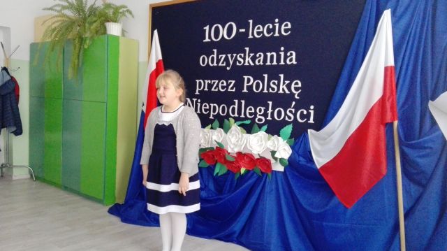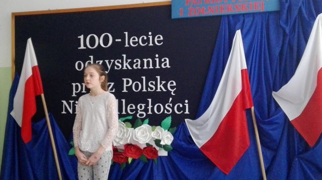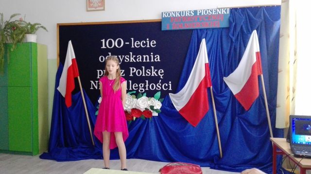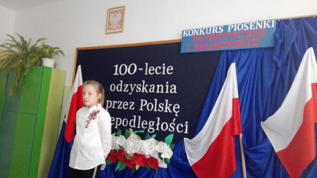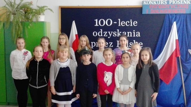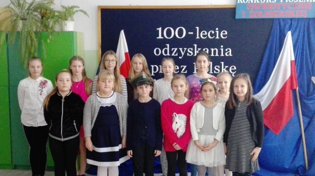W ramach obchodów 100 – lecia Odzyskania Niepodległości przez Polskę w dniu 7 grudnia 2018r. w świetlicy szkolnej odbył się szkolny konkurs piosenki patriotycznej i żołnierskiej. Komisja w składzie: przewodnicząca Elżbieta Denys, członkowie Ewa Dwornicka i Barbara Wojtiuk wysłuchała 13 uczestników z klas I – VI.