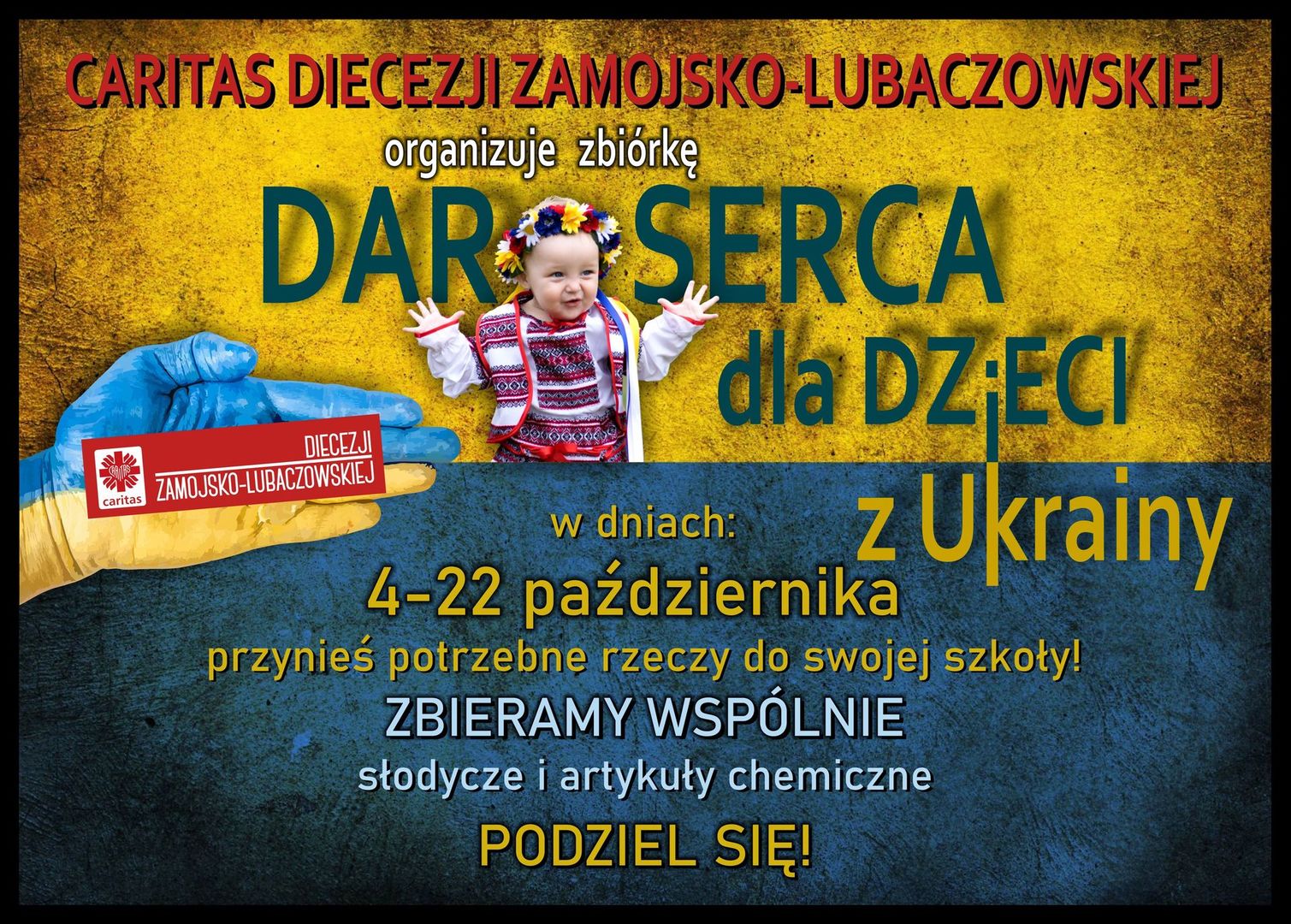 Od 4 do 22 października br. Caritas Diecezji Zamojsko-Lubaczowskiej wraz ze Szkolnymi Kołami Caritas i Parafialnymi Zespołami Caritas organizuje zbiórkę darów dla dzieci z Ukrainy. Jest to już kolejna edycja akcji, której przeznaczeniem jest przekazanie darów dla dzieci polonijnych z ubogich rodzin na Ukrainie. Zbieramy wspólnie słodycze i artykuły chemiczne, które należy przynosić do szkoły. Na parterze znajduje się pudełko z plakatem promującym zbiórkę, do którego wkładamy przyniesione rzeczy. Serdecznie dziękujemy za okazaną dobroć.