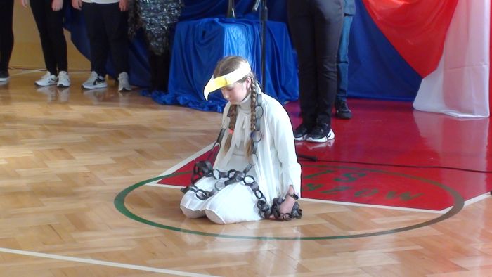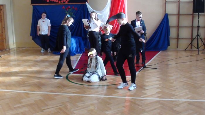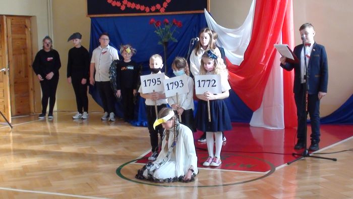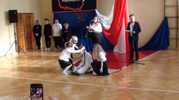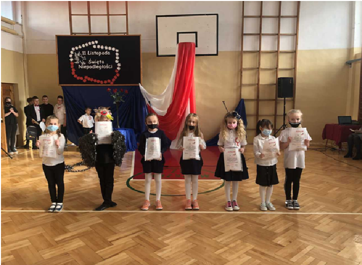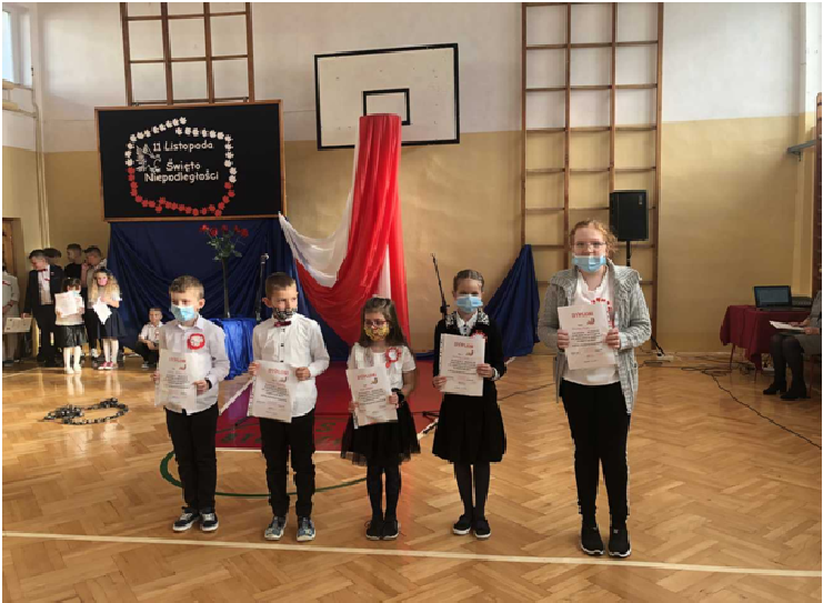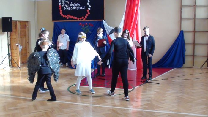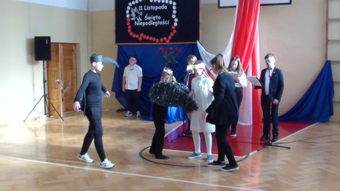 11 listopada to ważna data w świadomości Polaków. To właśnie 11 listopada 1918 roku, po 123 latach niewoli, Polska na nowo stała się państwem niepodległym. Ten szczególny dzień uczciliśmy odśpiewaniem Hymnu Państwowego o godz. 11:11. Uczniowie klasy VI pod okiem wychowawcy, pani Barbary Wojtiuk oraz we współpracy z uczniami klasy I i III przygotowali wzruszający montaż słowno-muzyczny. Okraszone wspaniałą oprawą muzyczną i elementami pantomimy, przedstawienie ilustrowało losy Polski i Polaków na przestrzeni 123 lat zmagań z zaborcami oraz walkę o wolność i niepodległość kraju. Dla widzów była to niezapomniana lekcja historii.