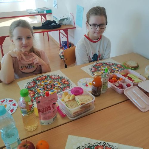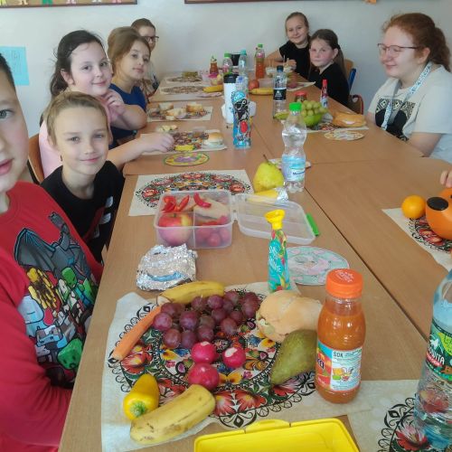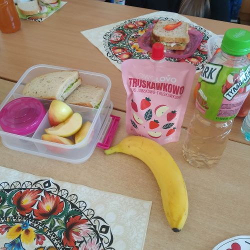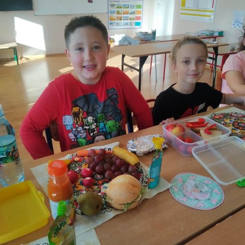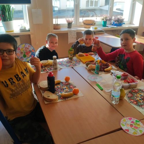 8 listopada klasa III w ramach projektu edukacyjnego „Z kotem Amadeuszem przez świat wartości i emocji”, wykonała kolejne zadanie dotyczące zdrowego odżywiania. Podczas zajęć, uczniowie poznali piramidę żywieniową, omówili zasady zdrowego stylu życia, następnie wspólnie zjedli zdrowe śniadanie. Samodzielnie przygotowane śniadanie, sprawiło naszym uczniom mnóstwo radości i przyjemności. Śniadania w postaci smacznych kolorowych kanapek, musów i sałatek owocowych potwierdziły, że trzecioklasiści w pełni potrafią zadbać o swoje zdrowie, używając produktów zapewniających energię na cały dzień!