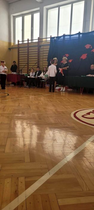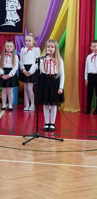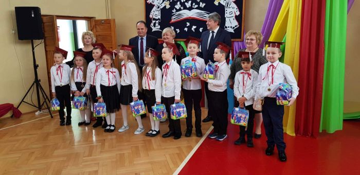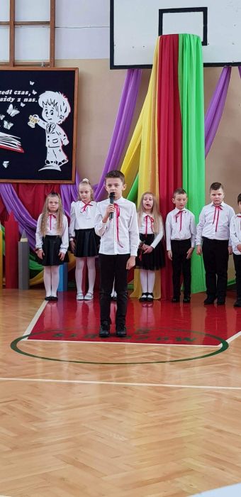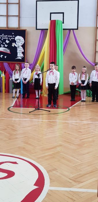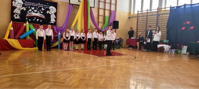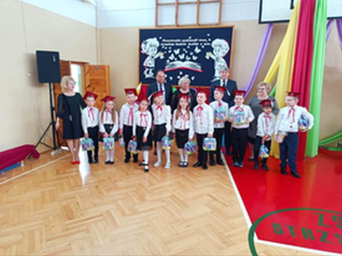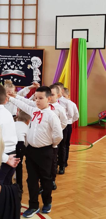 25 listopada 2022r. w naszej szkole odbyła się uroczystość Ślubowania i Pasowania na ucznia klasy I. Na uroczystości gościliśmy uczniów, nauczycieli, rodziców oraz panią dyrektor Elżbietę Denys, pana wójta Krzysztofa Bożka, pana dyrektora banku PKO BP Norberta Rybińskiego, panią dyrektor przedszkola Iwonę Dudkę, panią dyrektor biblioteki Stanisławę Czujkę, klasę zerową wraz z panią Betą Dumą. Uczniowie klasy pierwszej zaprezentowali część artystyczną, na którą składały się wiersze, piosenki oraz taniec polonez. Niespodzianką dla widzów był występ uczniów z flagami do piosenki patriotycznej ,,Mówię o Tobie Polsko” oraz podziękowanie rodzicom przez uczniów i wręczenie mamom goździków na tle melodii ,,Cudownych rodziców mam”. Najważniejszym jednak momentem uroczystości było ślubowanie i pasowanie na ucznia, którego dokonała pani dyrektor. Uczniowie otrzymali dyplomy, medale oraz kuferki ze słodyczami. Następnie ksiądz Adrian Borkowski poświęcił uczniów i ich plecaki. Na koniec uroczystości starsi uczniowie przywitali pierwszaków wierszami i prezentami. Zaproszeni goście również składali życzenia klasie I i wręczali prezenty. Po uroczystości były wspólne zdjęcia i ścianka przygotowana specjalnie na zdjęcia dla pierwszaków. Po sesji fotograficznej przyszedł czas na słodki poczęstunek. Nad całością uroczystości czuwała wychowawczyni klasy I pani Anna Nowosad.