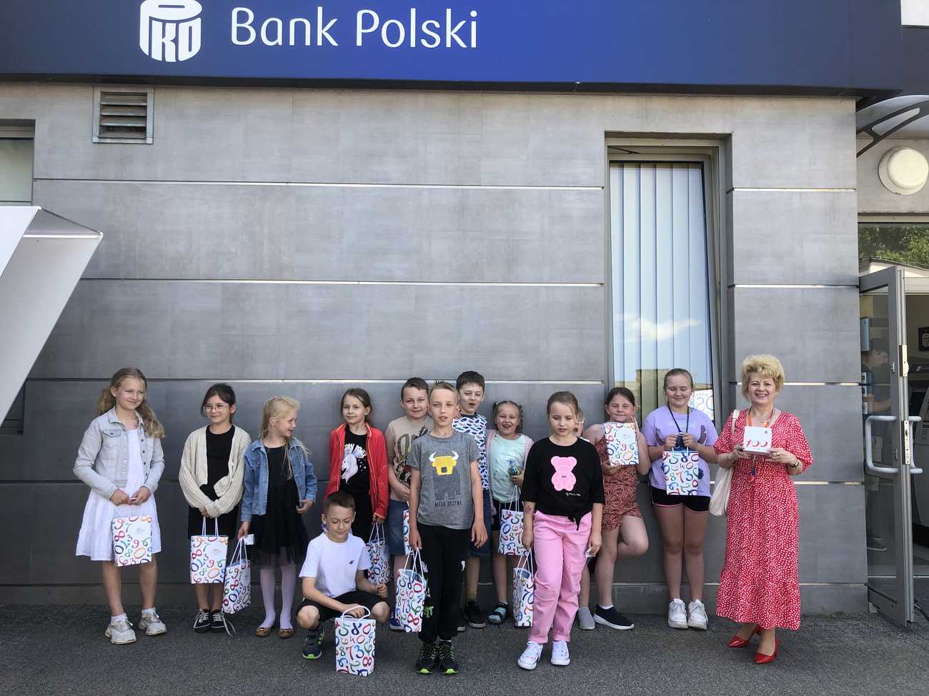 Uczniowie klasy I,II, III , którzy w tym roku systematycznie oszczędzali w SKO pojechali na wycieczkę edukacyjną do banku PKO BP w Hrubieszowie. Powitali nas pracownicy banku wraz z panem dyrektorem , który towarzyszył nam w naszym zwiedzaniu. Zapoznali się z pracą w banku , mogli pobrać numerek kasowy, oglądali banknoty w ultrafiolecie , poznawali waluty świata. Rozwiązywali zagadki , krzyżówki ,wykreślanki. Mogli zniszczyć papiery w niszczarce. Na koniec była wspólna fotografia , poczęstunek i prezenty , które przygotowali pracownicy banku. Uczniowie , którzy wykazali się wiedzą otrzymali dodatkową nagrodę. Wycieczka była bardzo udana. Organizatorem wyjazdu była opiekunka SKO.