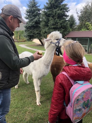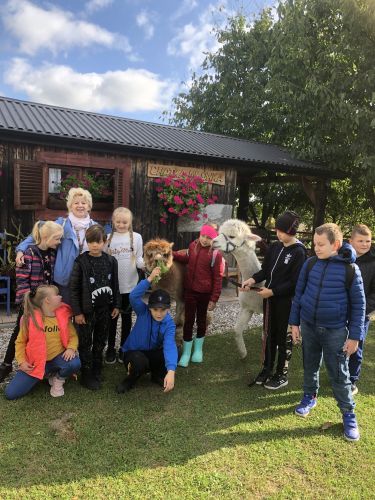 6.10.2023 r. w Światowy Dzień Zwierząt uczniowie klasy II wraz z wychowawczynią p. Anną Nowosad udali się do miejscowości Brodzica, gdzie znajduje się zagroda alpak. Na początku powitał nas właściciel, który w ciekawy sposób opowiadał o życiu i przyzwyczajeniach tych zwierząt. Ustalił zasady przebywania wśród zwierząt , żeby nie wystraszyły się. W zagrodzie uczniowie mogli nakarmić zwierzątka , przytulić się do nich, a także zrobić z nimi zdjęcia. Kiedy opuściły zagrodę i wyszły na podwórko dzieci dawały im do zjedzenia gruszkę, liście winogrona i inne listki. Następnie w asyście psa udaliśmy się nad rzekę Huczwę i wysłuchaliśmy legendy o szlaku handlowym i o zamku, którego ruiny znajdują się w niedalekiej odległości. Mogliśmy zobaczyć jak wyszkolony jest pies, który aportował w wodzie. Po powrocie dzieci mogły pobawić się w budynku przygotowanym dla zwiedzających. W tym czasie rodzice przygotowali ognisko , gdzie mogliśmy upiec kiełbaski ,które wszyscy ze smakiem zjedli . Po pożegnaniu z właścicielem i alpakami wróciliśmy pełni wrażeń i bardzo zadowoleni do Strzyżowa.