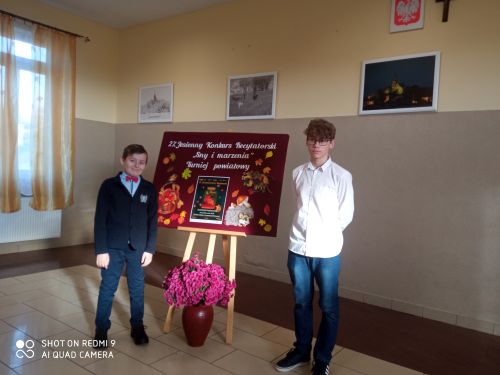 Laureaci etapu gminnego: Wiktor Pałys i Karol Pysiewicz reprezentowali naszą szkołę w eliminacjach powiatowych w Trzeszczanach w dniu 16.11.2023 r. Komisja konkursowa nominowała do etapu wojewódzkiego w kategorii uczniów szkół podstawowych kl. VII – VIII – Karola Pysiewicza.