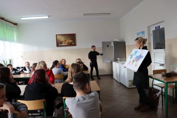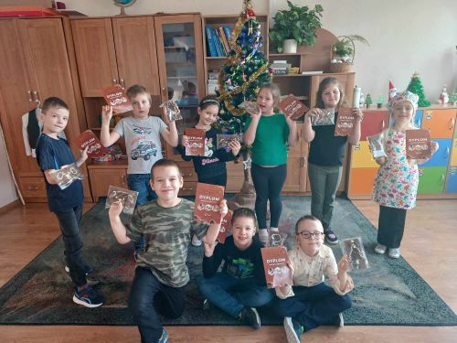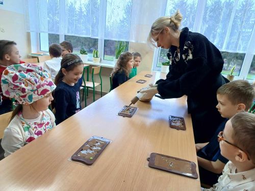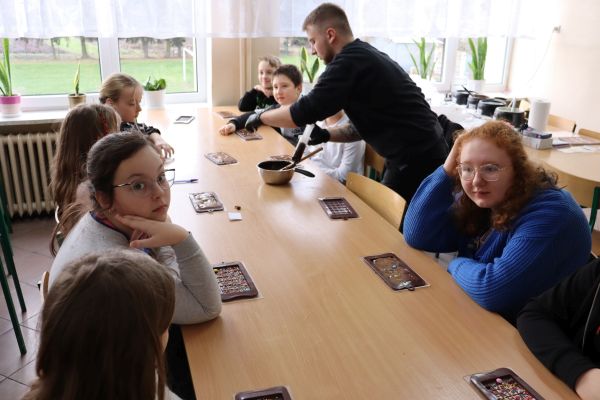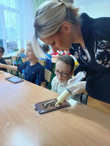 22 grudnia w naszej szkole odbyły się warsztaty z wyrobu czekolady. Uczniowie mogli dowiedzieć się z czego robi się czekoladę i jakie są jej rodzaje. Mogli także obejrzeć ziarno kakaowca. Następnie sami wybierali dodatki do swojej czekolady, po czym prowadzący za pomocą strzykawki rozprowadzali czekoladę do foremek - najpierw mleczną, potem gorzką, a na końcu białą. Prowadząca rysowała wybrane przez dzieci elementy na wyrabianych przez nie tabliczkach. Każdy uczeń otrzymał dyplom "Mistrza Czekolady" oraz mógł zabrać do domu zrobioną przez siebie czekoladę.