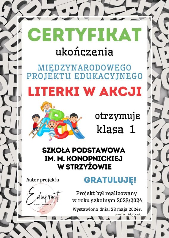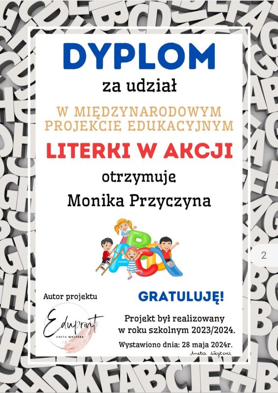 Projekt „Literki w akcji” realizowany był w klasie I od października 2023 do maja 2024 roku. Celem głównym była aktywizacja uczniów w procesie nauki alfabetu, rozwijanie kompetencji kluczowych poprzez integrację nauki z działaniami twórczymi i wykorzystaniem różnorodnych metod. Projekt miał również na celu wzmocnienie współpracy między domem a szkołą oraz rozwój kompetencji społecznych uczniów. Projekt był realizowany poprzez różnorodne zadania, które obejmowały wprowadzanie nowych liter. Każde zajęcia były starannie przygotowane i dostosowane do indywidualnych potrzeb uczniów, co pozwoliło na skuteczne osiąganie założonych celów edukacyjnych. Rodzice byli zaangażowani w proces edukacyjny poprzez regularne informowanie o postępach ich dzieci, co pozwoliło na lepsze zrozumienie metodyki i celów projektu. Nauczyciele z innych szkół również mieli dostęp do materiałów i pomysłów poprzez grupę na Facebooku, co umożliwiło wymianę doświadczeń i dalsze rozwijanie projektu. Uczniowie klasy I wykazali znaczące postępy w nauce alfabetu, co było widoczne w ich umiejętnościach czytania i pisania. Ponadto, poprzez realizację zadań rozwijających motorykę małą, uczniowie znacznie poprawili swoje umiejętności manualne. Praca w parach i grupach znacznie zwiększyła zdolności komunikacyjne i współpracy wśród uczniów. Podczas realizacji zadań grupowych, uczyli się wspólnego planowania. Zadania te nie tylko wzmocniły ich umiejętności interpersonalne, ale także pogłębiły zrozumienie nauki liter przez współdziałanie. Wykorzystanie zajęć ruchowych miało kluczowe znaczenie dla nauki liter w sposób angażujący i dynamiczny. Uczniowie uczestniczyli w grach i zabawach, które wymagały zaangażowania fizycznego. Dzięki temu nie tylko lepiej zapamiętywali nowe litery, ale także rozwijali koordynację i zdolności motoryczne. Zajęcia sensoryczne w nauce liter cieszyły się wielkim zainteresowaniem. Używając różnorodnych materiałów, dzieci miały możliwość kreowania liter palcami, co wspomagało rozwój ich sensorycznej percepcji. Te metody, poprzez angażowanie różnych zmysłów, pozwoliły dzieciom na lepsze zapamiętywanie i rozumienie alfabetu w przyjemny i naturalny sposób. Realizacja projektu "Literki w akcji" wykazała, że integracja różnorodnych metod może znacząco wpłynąć na efektywność edukacyjną. Uczniowie mogli doświadczać nauki liter w wielu wymiarach.