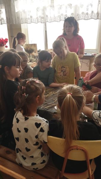 Z wielkim zaangażowaniem kleiły piękne kwiaty i układały wianuszki z traw. Mamy nadzieje , że spotkania z panią Kasią – naszym lokalnym twórcą ludowym będą odbywały się cyklicznie.