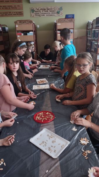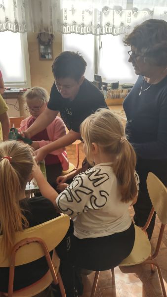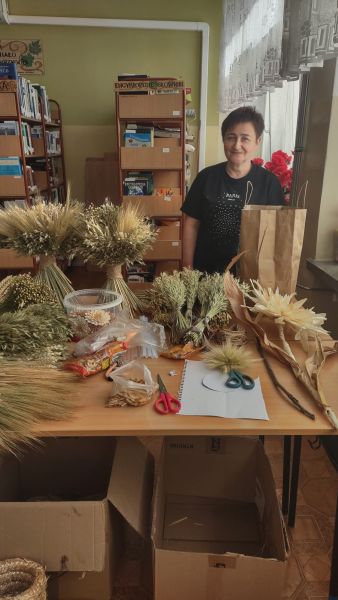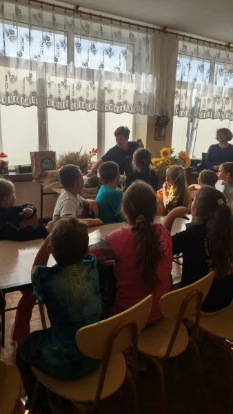 Na pierwszym spotkaniu dla kl. I, II, III zaprezentowała uczniom kwiatki wykonane z ziaren dyni, słonecznika, kukurydzy oraz wianki wykonane z różnego rodzaju zbóż i traw wcześniej starannie wysuszonych. Dzieci dowiedziały się jak należy i kiedy gromadzić rośliny, aby potem układać z nich piękne kompozycje.