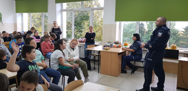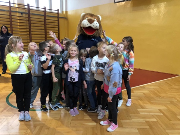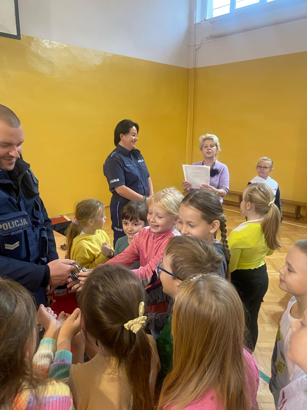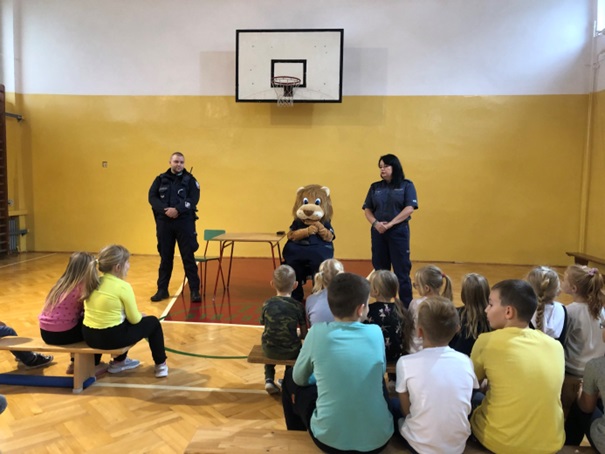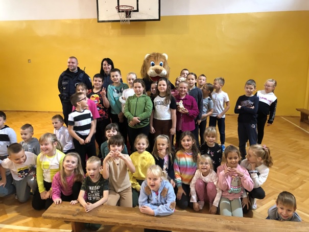 11.10.2024 r. w naszej szkole odbyło się spotkanie z funkcjonariuszami Powiatowej Policji w Hrubieszowie. Najpierw funkcjonariusze w asyście maskotki policyjnej - lwa spotkali się z uczniami klas I-III. Pani policjantka na początku opowiedziała o bezpieczeństwie dzieci na drodze, przypomniała zasady poruszania się po jezdni i na pasach. Przypomniała o ważnym numerze alarmowym i jak zawiadomić odpowiednie służby w razie zdarzenia. Poruszyła również kwestię bezpiecznego korzystania z internetu a w szczególności korzystania z gier oraz o hejcie w mediach społecznościowych. Na koniec były pytania uczniów, przytulanie z maskotką i pamiątkowe zdjęcia. Druga część wizyty funkcjonariuszy to spotkanie z młodzieżą klas IV-VIII . Policjanci zapoznali uczniów z konsekwencjami prawnymi niewłaściwych zachowań, rozmawiali z nimi na temat hejtu, używek i zasad pierwszej pomocy. Na koniec koordynator szkolny - opiekunka SKO Anna Nowosad wręczyła funkcjonariuszom podziękowania za spotkanie.
