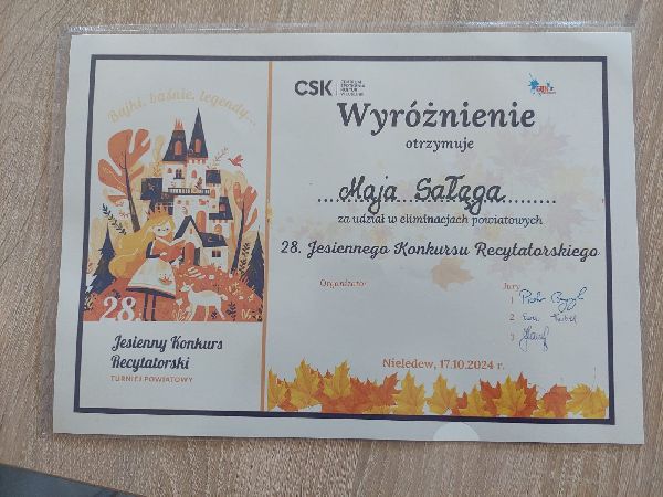 Uczennica kl. I Maja Sałęga została wyróżniona w eliminacjach powiatowych 28. Jesiennego Konkursu Recytatorskiego. Gratulujemy i życzymy kolejnych sukcesów!