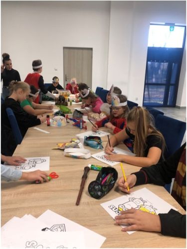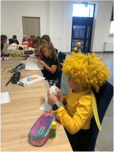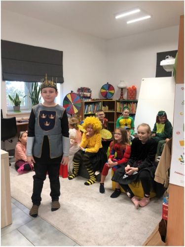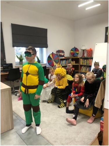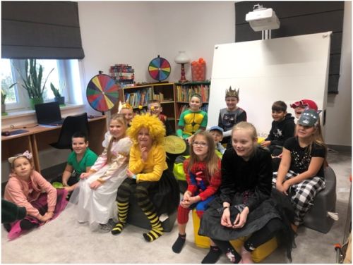 5.11.2024 r. uczniowie klasy III wraz z wychowawczynią Anną Nowosad udali się do Biblioteki Wiejskiej, aby uczestniczyć w zajęciach bibliotecznych, które poświęcone były ,,Dniu Postaci z bajek”. Nasza przygoda z bajkami rozpoczęła się od prezentacji przygotowanych strojów, w które ubrały się dzieci. Następnie pani Magda przeczytała baśń pt. "Szewczyk Dratewka”, a uczniowie odpowiadali na przygotowane pytania. Nie zabrakło zagadek i innych zadań związanych z bajkami. Radość sprawiło uczniom wykonanie opasek z postaciami z bajek i kolorowanki. Za udział w zadaniach uczniowie otrzymali od pań dyplomy i lizaczki. Na koniec był słodki poczęstunek i sesja fotograficzna upamiętniająca nasze spotkanie, a wychowawczyni wręczyła podziękowania paniom bibliotekarkom za zajęcia. To była prawdziwa lekcja w bajkowym świecie. Zadowoleni i pełni wrażeń wróciliśmy do szkoły .