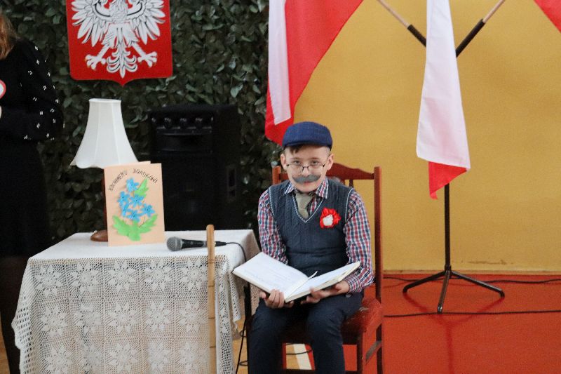 Po hymnie uczniowie klasy VI i I zaprezentowali część artystyczną. W formie dialogu dziadka z wnukami przedstawili tło historyczne i wagę wydarzeń, które doprowadziły od odzyskania niepodległości. Całość okraszona była wzruszającymi pieśniami patriotycznymi.