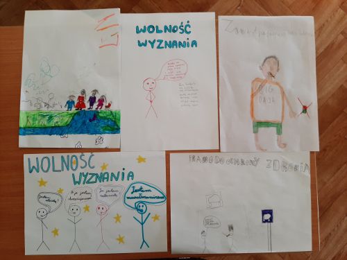 Zagadnienia z zakresu znajomości praw człowieka, uczniowie naszej szkoły poznali na lekcjach wychowawczych oraz WOS, na których wykorzystano prezentację multimedialną przygotowaną przez Szkolnego Rzecznika Praw Ucznia. Na drugim piętrze pojawiła się gazetka informacyjna na ten temat. Nabytą w ten sposób wiedzę sprawdziliśmy za pomocą gry dydaktycznej utworzonej na platormie Wordwall. Uczniowie klasy V i VI zilustrowali najważniejsze dla siebie prawa człowieka.