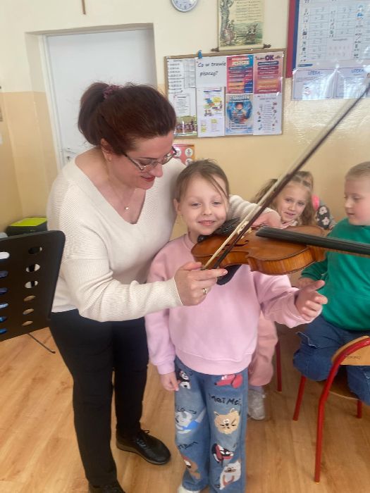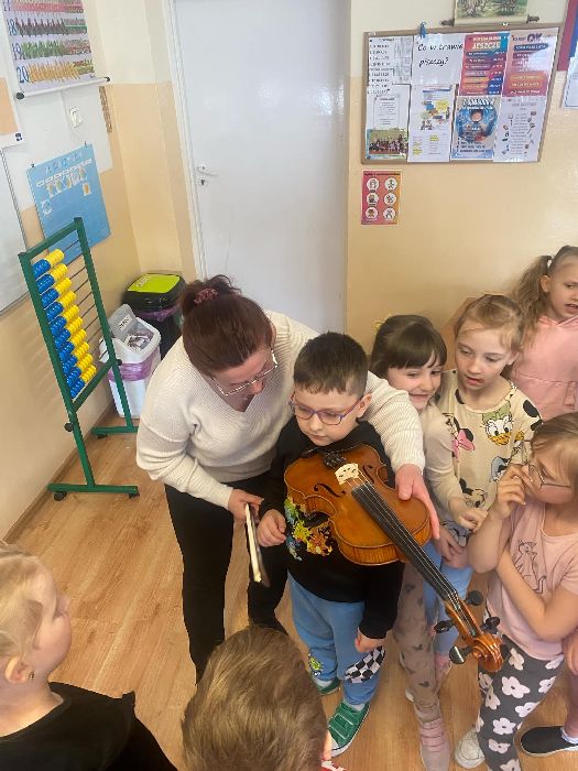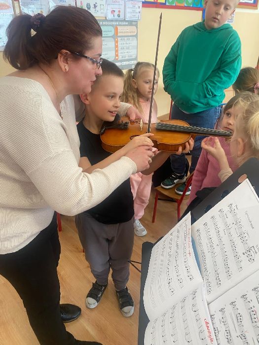 Uczniowie klasy I mieli okazję wziąć udział w niezwykłej lekcji muzyki, na której gościła jedna z mam. Pani Iryna jest profesjonalną skrzypaczką. Dzieci doświadczyły muzyki granej na żywo, mogły także dotknąć skrzypiec, a nawet sprawdzić jak powinno wyglądać ich ułożenie. Dziękujemy pani Irynie za poświęcony czas i niesamowitą ucztę muzyczną :)