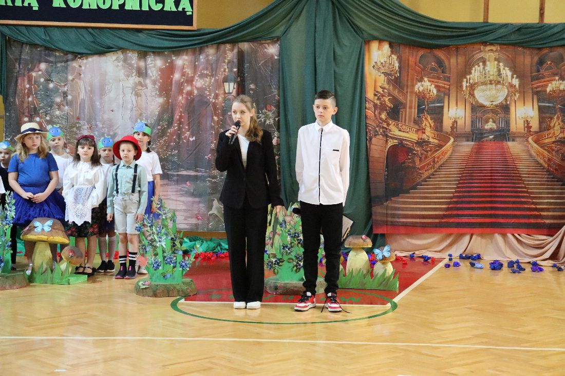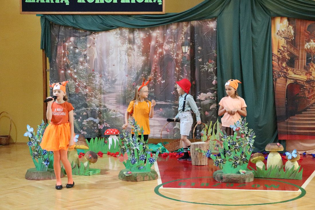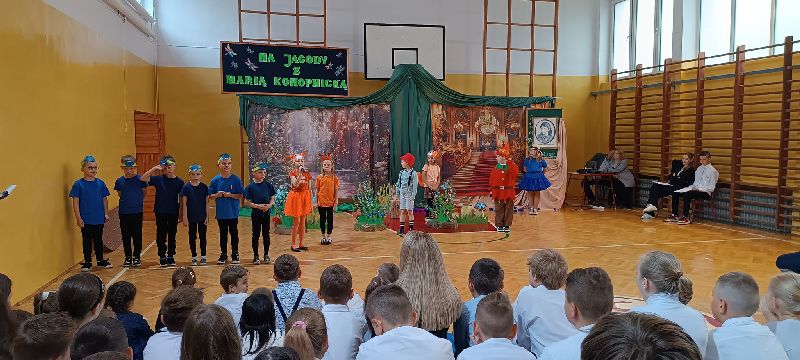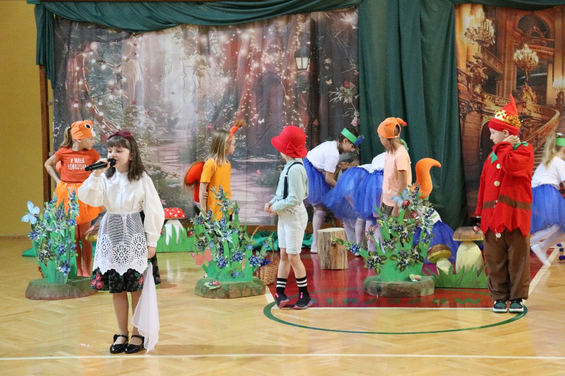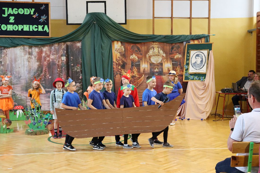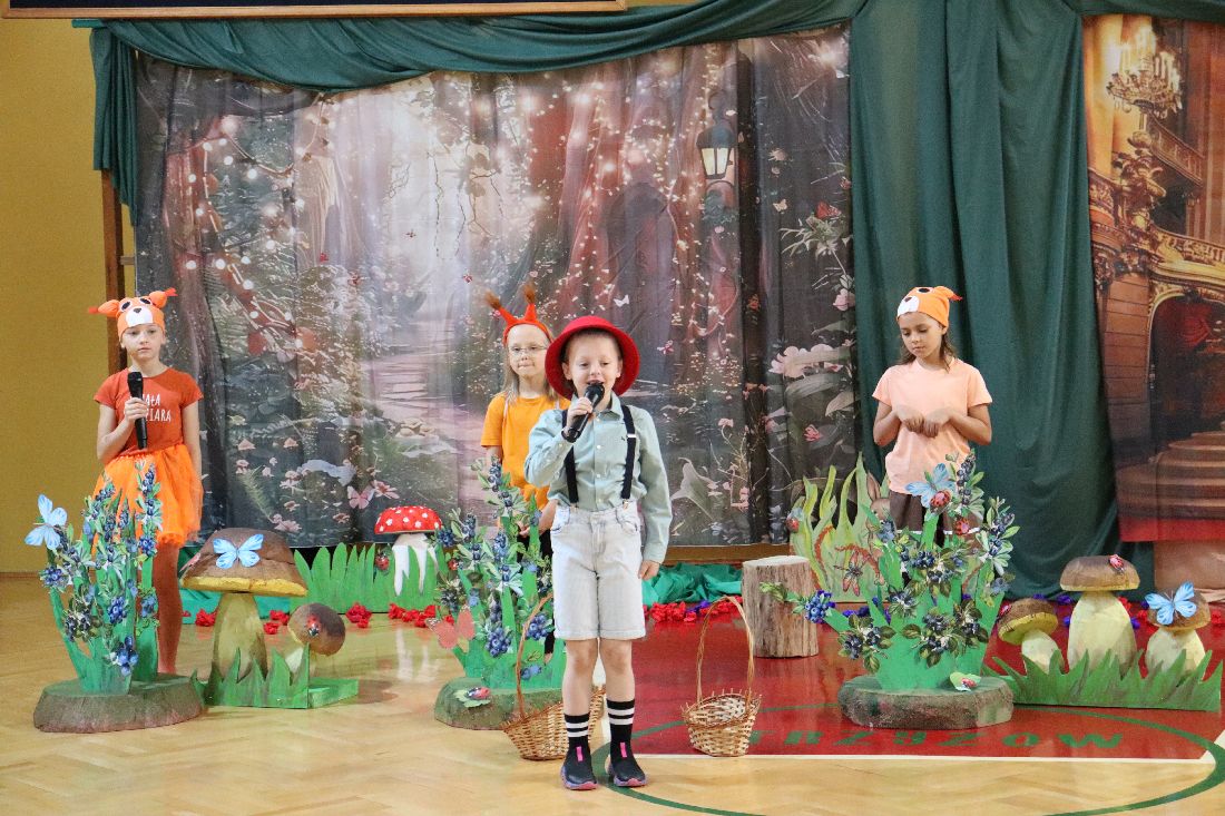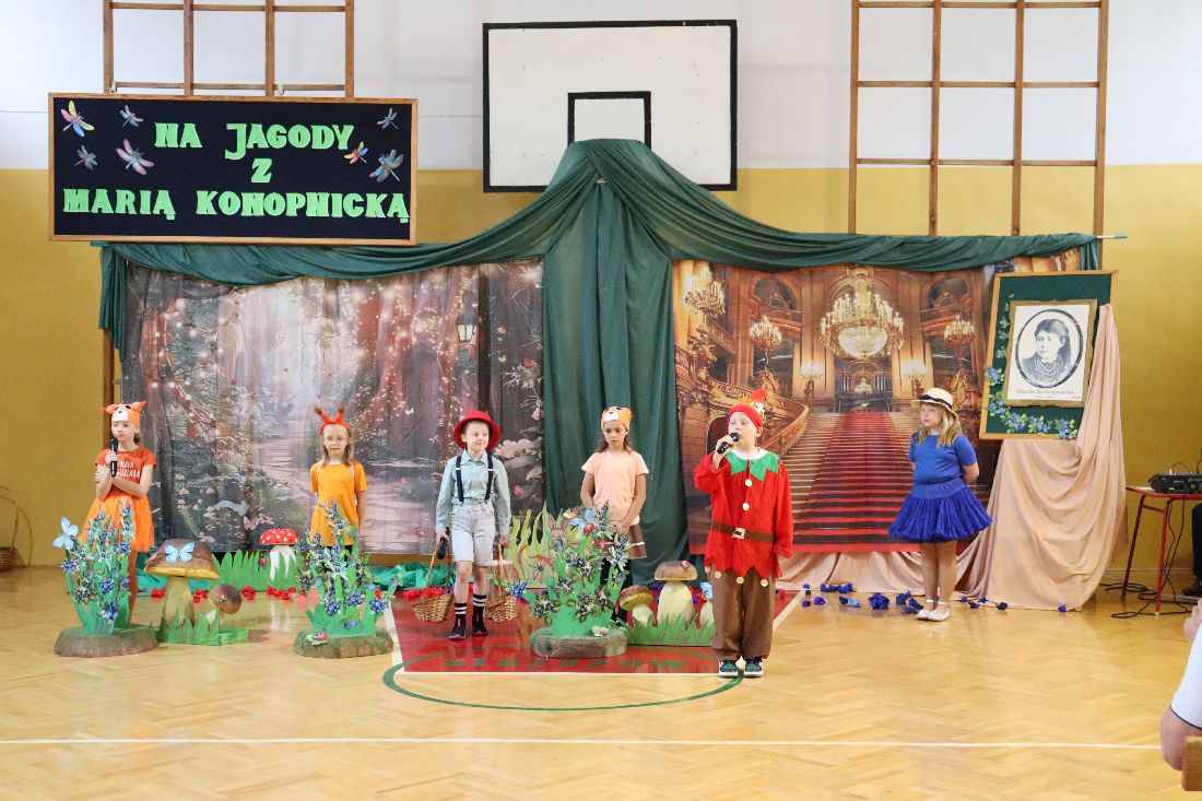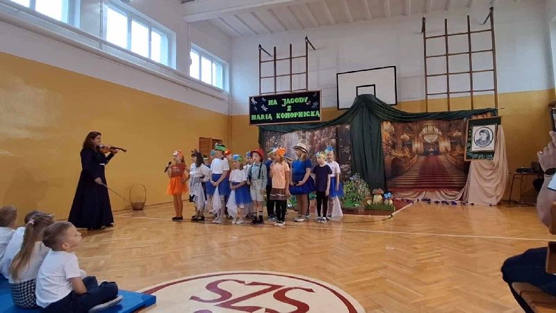 23 maja 2025 roku, w dzień urodzin Marii Konopnickiej - Patronki Szkoły Podstawowej w Strzyżowie, uczniowie klasy pierwszej zaprosili społeczność szkolną ,,Na jagody". Młodzi aktorzy zabrali nas do świata małego Janka, który pragnie zrobić mamie urodzinową niespodziankę i wybiera się do boru w czerwonym kapeluszu, aby nazbierać koszyczek jagód. Przedstawienie okraszone było fantastyczną oprawą muzyczną - piosenkami i tańcami w wykonaniu Pierwszaków przy przepięknym akompaniamencie skrzypiec pani Iriny.