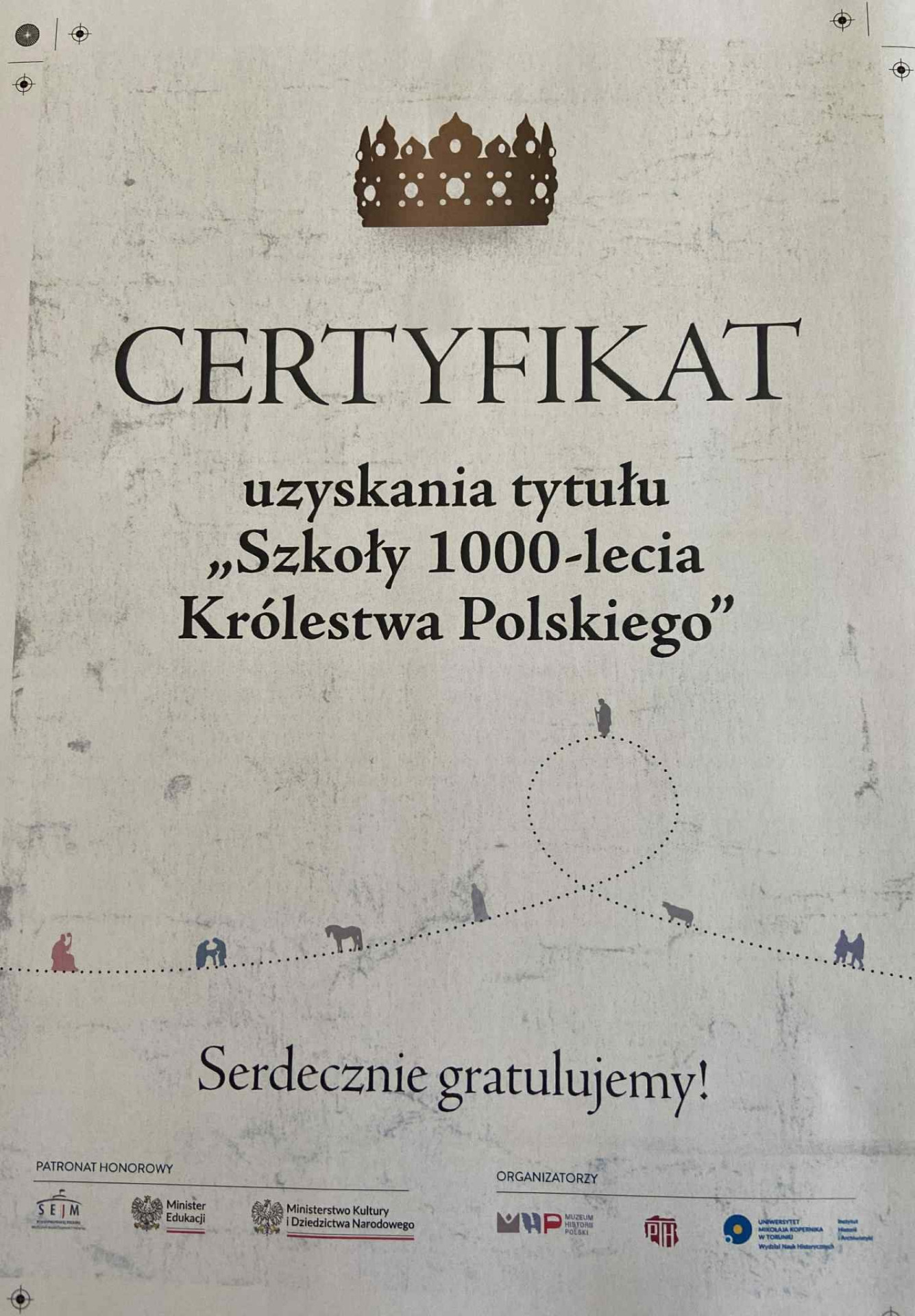 Nasza szkoła otrzymała certyfikat „Szkoła 1000-lecia”! To wyróżnienie jest dla nas ogromnym zaszczytem i potwierdzeniem zaangażowania całej społeczności szkolnej – uczniów, nauczycieli, rodziców i pracowników. Razem tworzymy miejsce, w którym tradycja spotyka się z nowoczesnością, a edukacja jest prawdziwą wartością. Dziękujemy wszystkim, którzy przyczynili się do tego sukcesu!