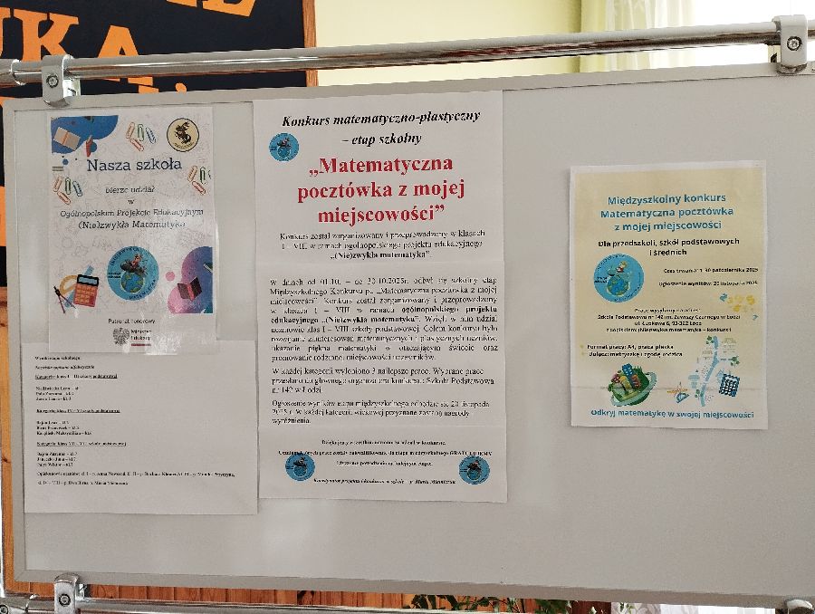 W dniach od 1 do 30 października 2025 r. odbył się szkolny etap Międzyszkolnego Konkursu pt. „Matematyczna pocztówka z mojej miejscowości”. Konkurs został zorganizowany i przeprowadzony w klasach I – VIII w ramach ogólnopolskiego projektu edukacyjnego „(Nie)zwykła matematyka”. Wzięli w nim udział uczniowie klas I – VIII szkoły podstawowej. Celem konkursu było rozwijanie zainteresowań matematycznych i plastycznych uczniów, ukazanie piękna matematyki w otaczającym świecie oraz promowanie rodzinnej miejscowości uczestników. W każdej kategorii wyłoniono 3 najlepsze prace. Wybrane prace przesłano do głównego organizatora konkursu: Szkoła Podstawowa nr 142 w Łodzi. Ogłoszenie wyników etapu międzyszkolnego odbędzie się 20 listopada 2025 r. W każdej kategorii wiekowej przyznane zostaną nagrody i wyróżnienia. Koordynatorem projektu i konkursu w szkole jest p. Maria Mielniczuk.